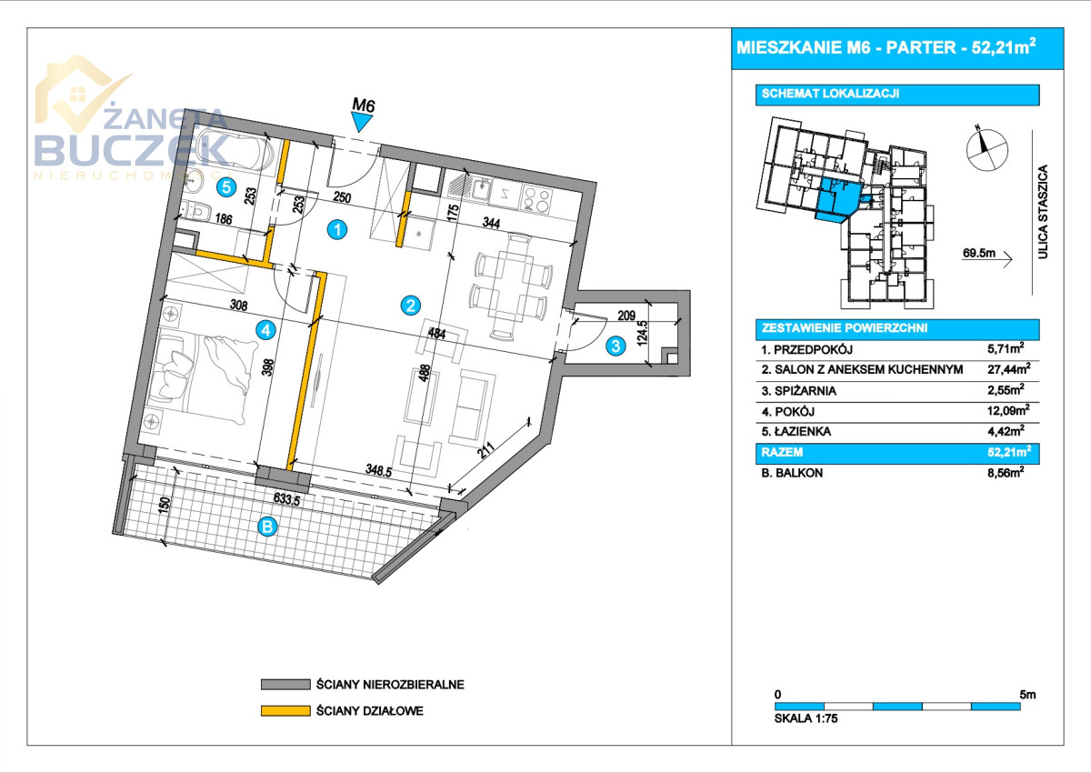 Powierzchnia mieszkania wynosi 52,25 m2 i składa się z: