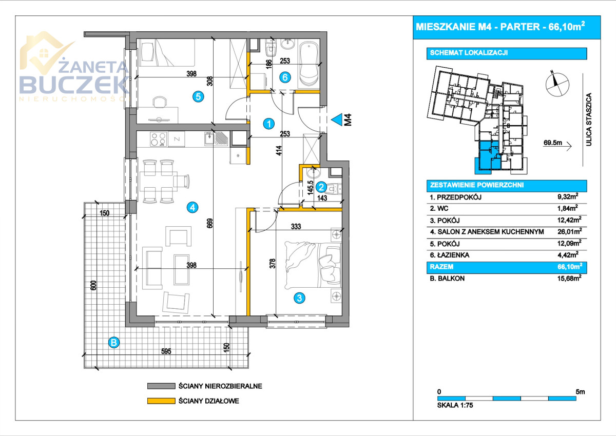 Powierzchnia mieszkania wynosi 66,10 m2 i składa się z: