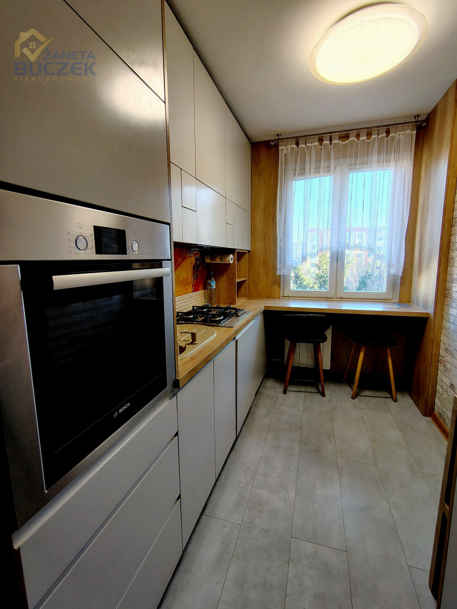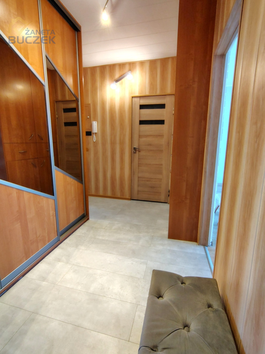 Po wejściu do mieszkania znajduje się przestronny korytarz zapewniający wygodną komunikację między pomieszczeniami oraz miejsce na przechowywanie. Kuchnia jest w pełni zabudowana i wyposażona w sprzęt AGD: lodówkę, zmywarkę oraz piekarnik, dzięki czemu jest gotowa do codziennego użytkowania.