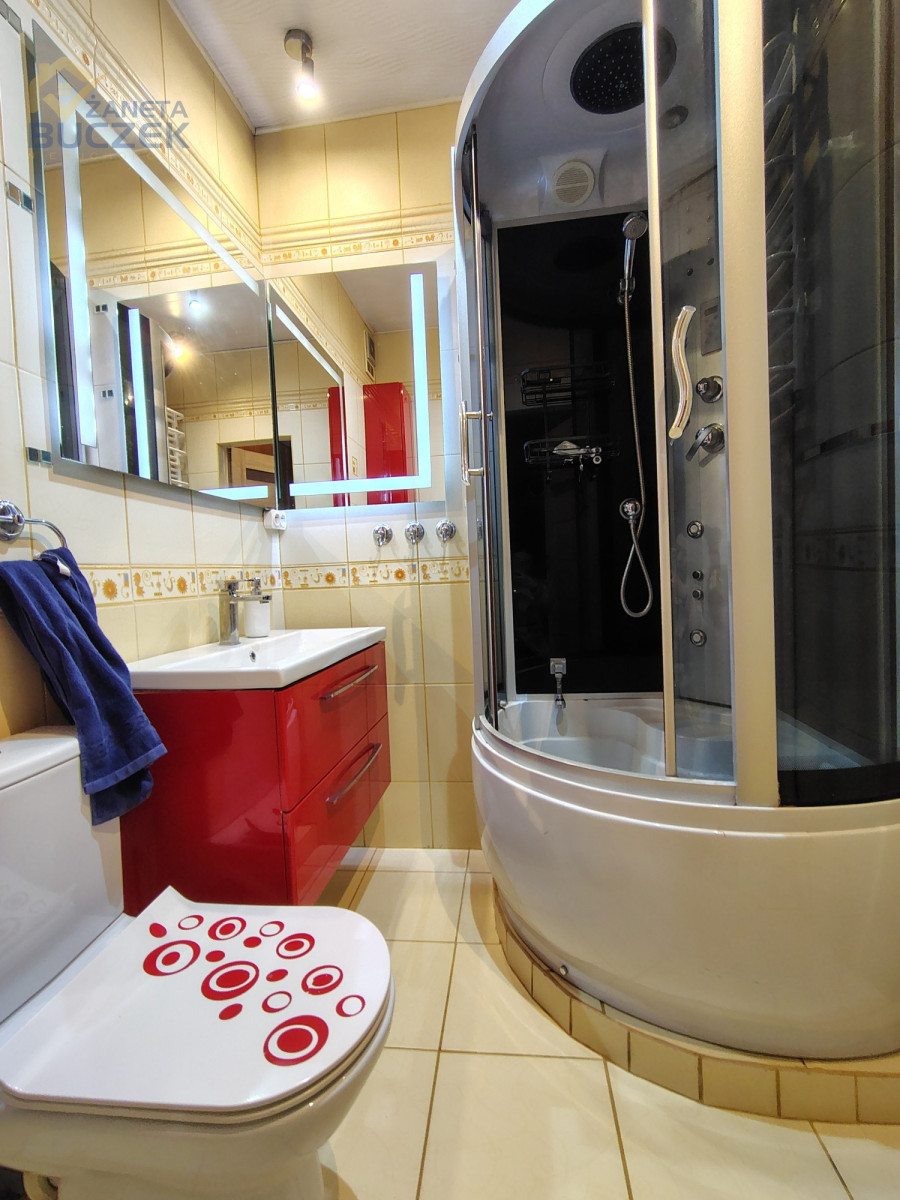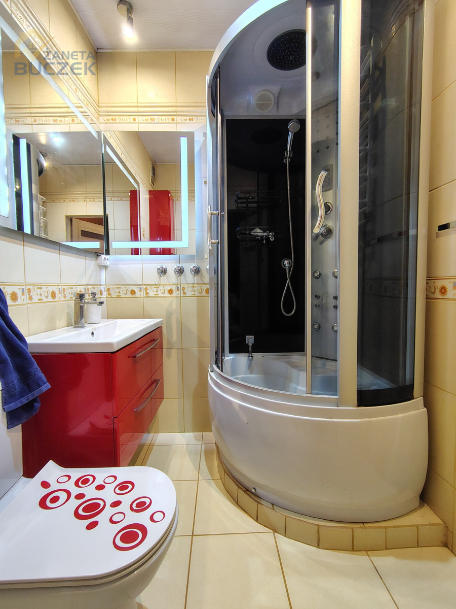 Łazienka wyposażona jest w kabinę prysznicową oraz niezbędną armaturę. Mieszkanie posiada również przestronną sypialnię, która daje możliwość wygodnej aranżacji i stworzenia komfortowej strefy wypoczynku.