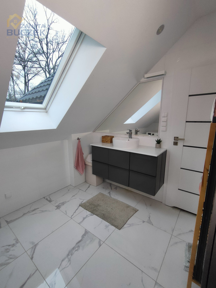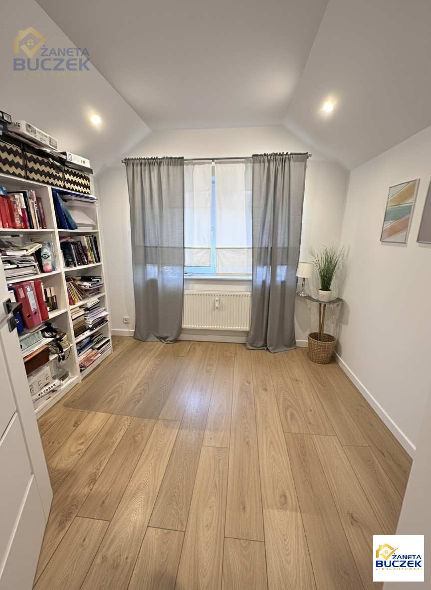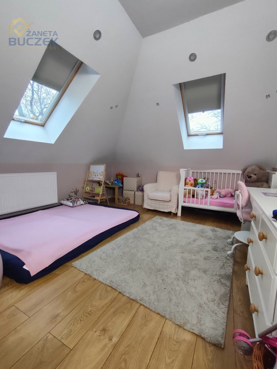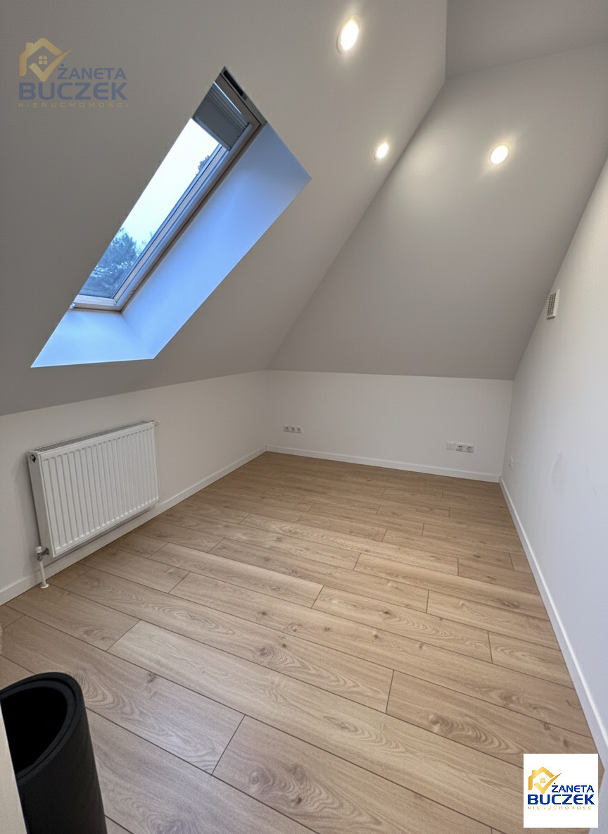 Sypialnie: Dwa doskonale doświetlone pokoje, wyposażone w okna dachowe oraz standardowe, zapewniające dużo naturalnego światła. Sypialnia główna z własną garderobą i sypialnia dziecięca.