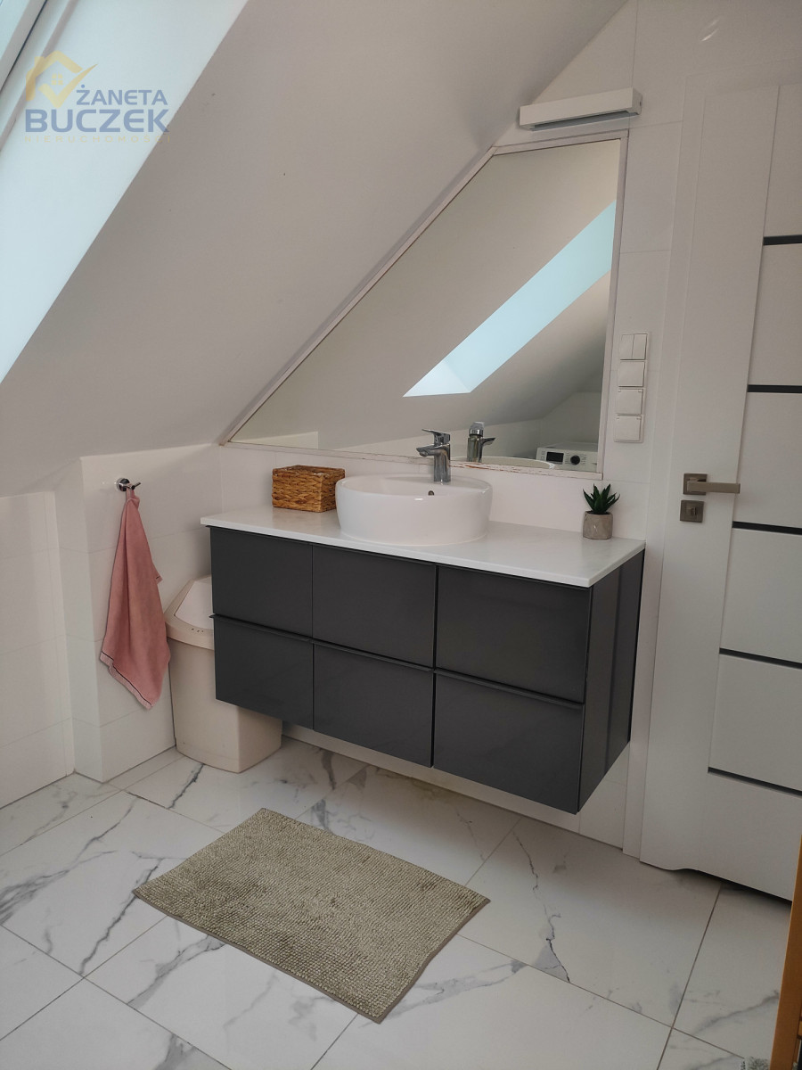 Łazienka główna: Stylowa i jasna, urządzona z dbałością o detale. Wykończona błyszczącym białym gresem z efektem marmuru, który pokrywa również wannę. Pojemna szafka podumywalkowa w kolorze grafitu oraz duże lustro pod skośnym dachem tworzą nowoczesną i funkcjonalną przestrzeń relaksu. Dodatkowo w łazience zaaranżowano praktyczne miejsce na pralnię.