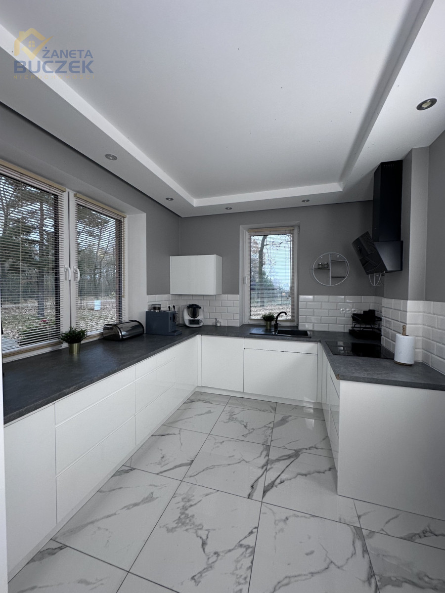 Kuchnia: Zaprojektowana w taki sposób by jak najbardziej wykorzystać przestrzeń i potencjał. Białe minimalistyczne fronty szafek i blat w kolorze głębokiego antracytu to ponadczasowa elegancja.