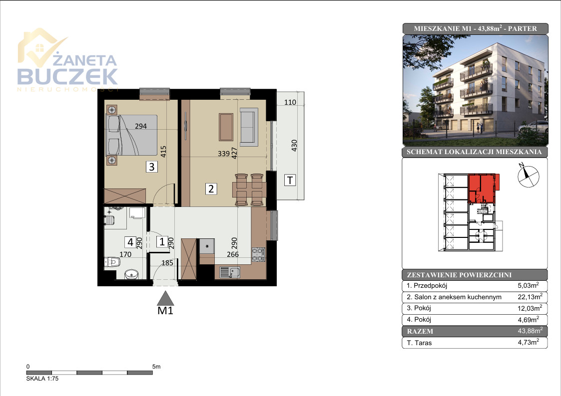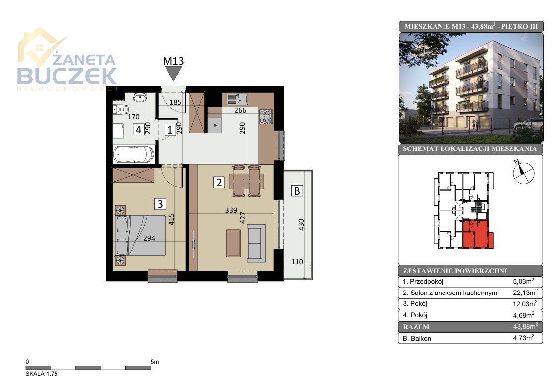 - Powierzchnia: 43,88 m²